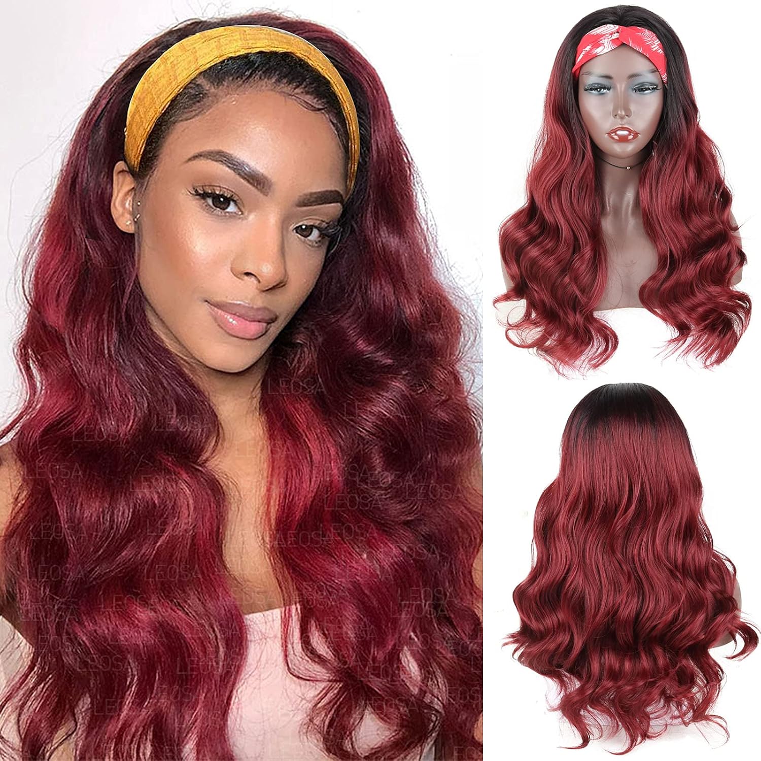 Leosa Ombre Burgundy Headband Wig Body Wave Synthetic Red Wigs F